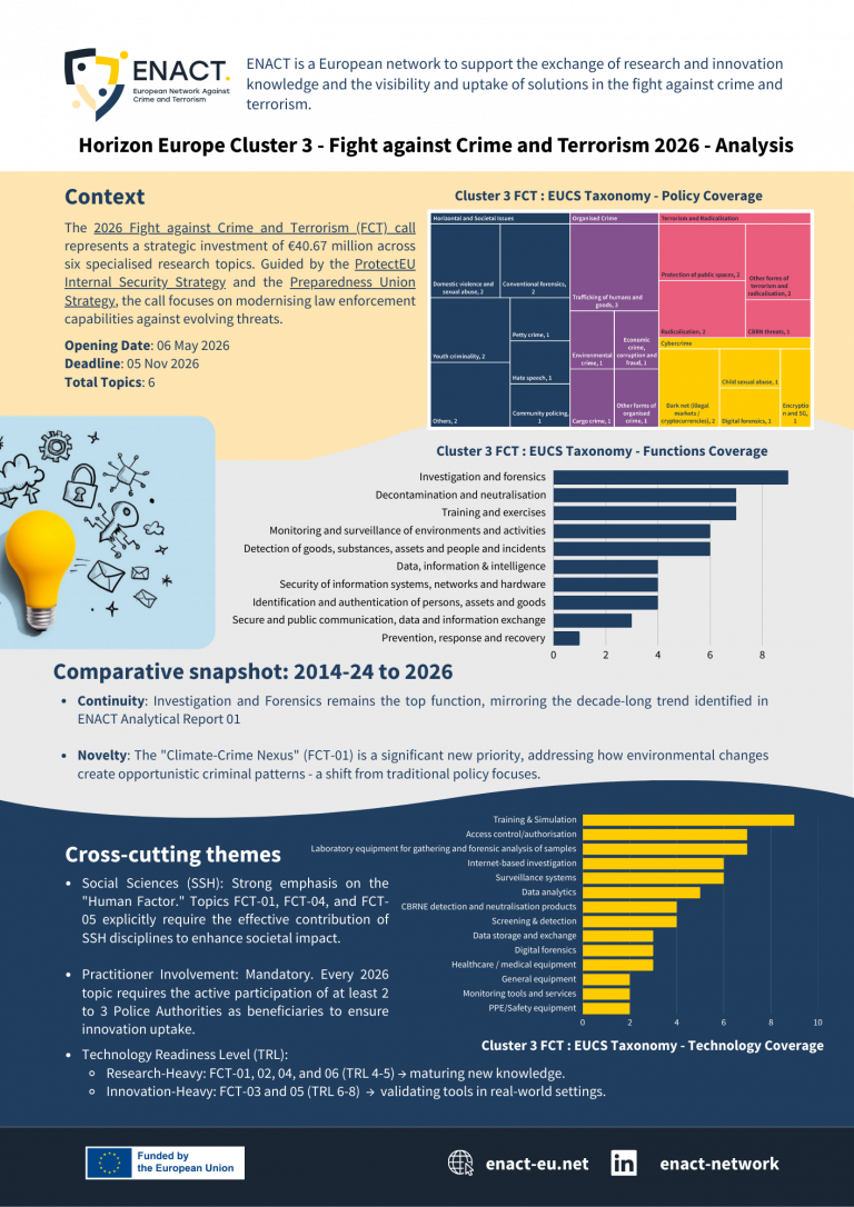 ENACT has published a new Factsheet analysing the Horizon Europe Cluster 3 “Fight against Crime and Terrorism” (FCT) call for 2026.